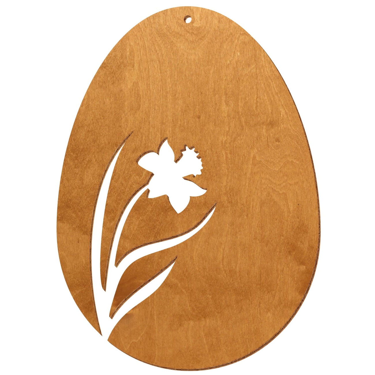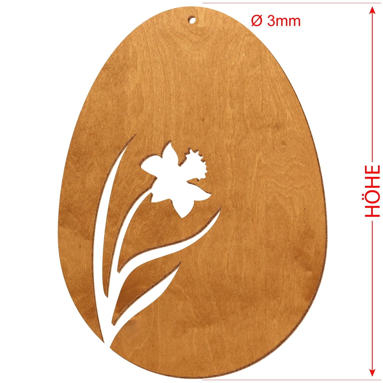 Motiv Osterei aus 3 mm starkem Birkensperrholz in der Farbe Birnbaum und mit Klarlack versiegelt - 16 verschiedene Motive mit Aufhängeloch Ø 3 mm - Größenauswahl von 7 bis 50 cm Höhe