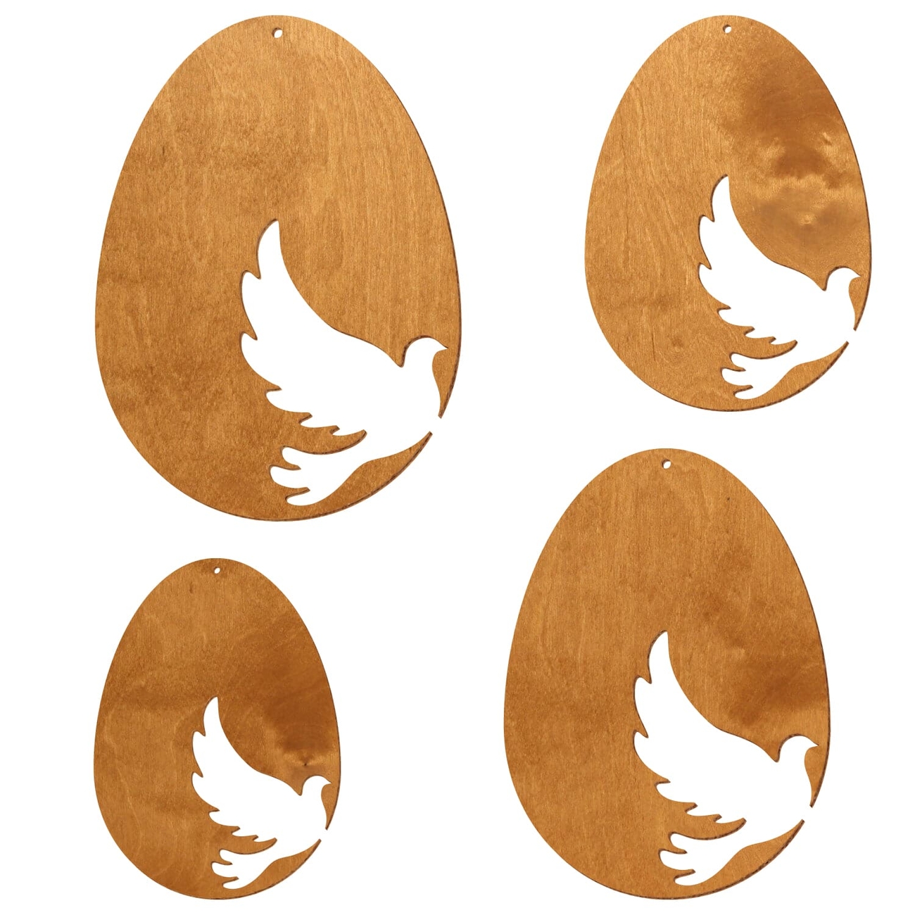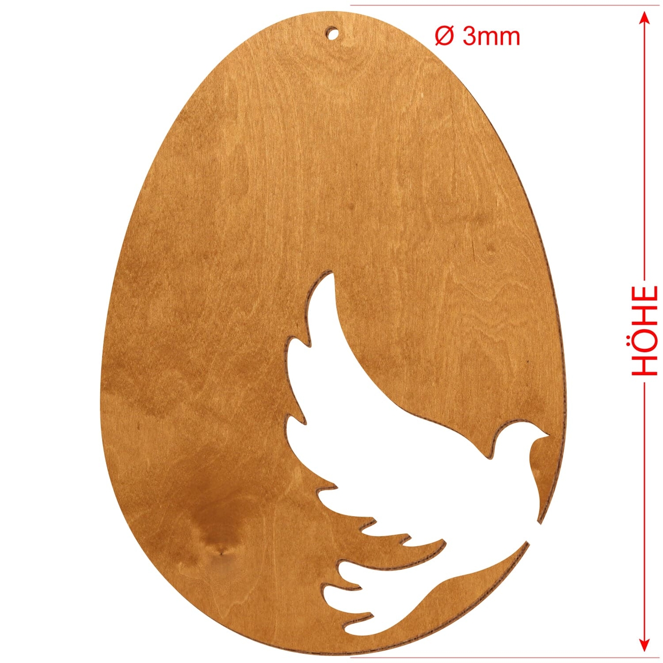 Motiv Osterei aus 3 mm starkem Birkensperrholz in der Farbe Birnbaum und mit Klarlack versiegelt - 16 verschiedene Motive mit Aufhängeloch Ø 3 mm - Größenauswahl von 7 bis 50 cm Höhe