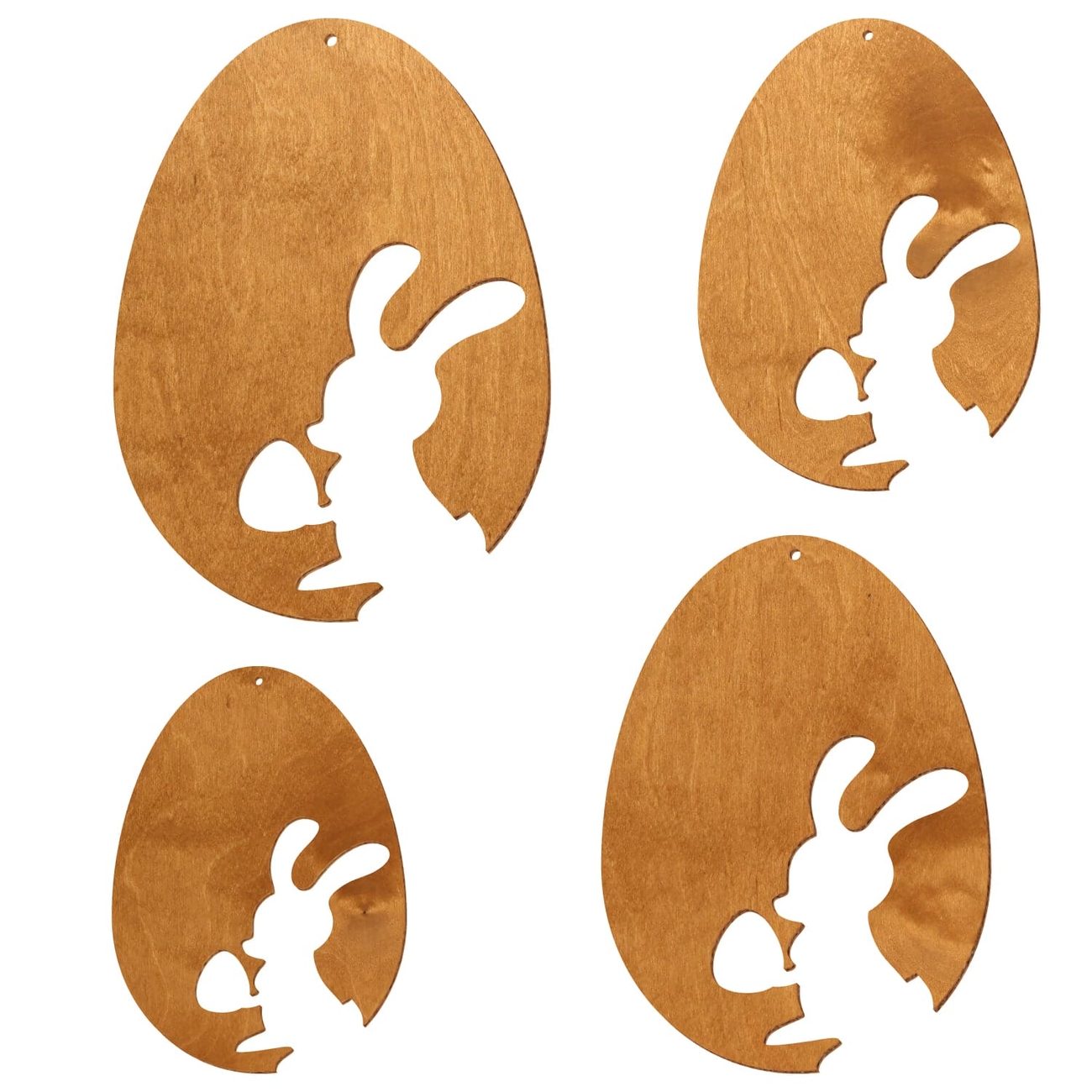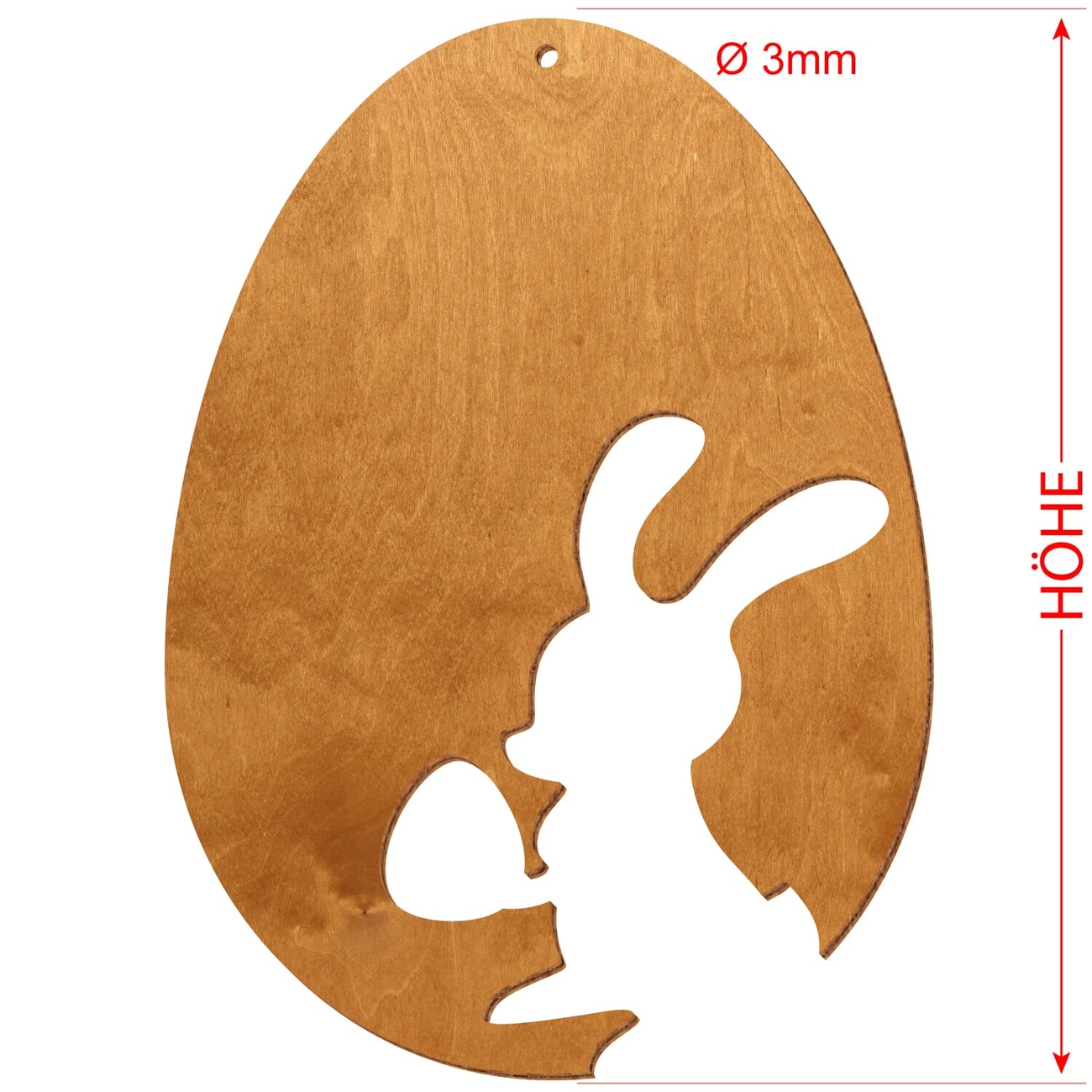 Motiv Osterei aus 3 mm starkem Birkensperrholz in der Farbe Birnbaum und mit Klarlack versiegelt - 16 verschiedene Motive mit Aufhängeloch Ø 3 mm - Größenauswahl von 7 bis 50 cm Höhe