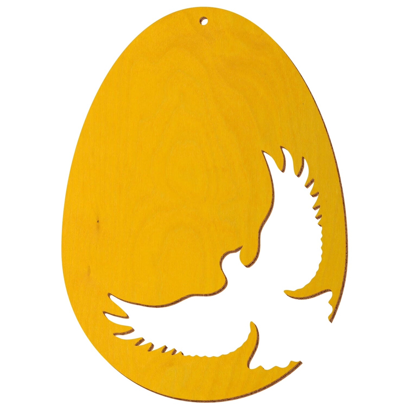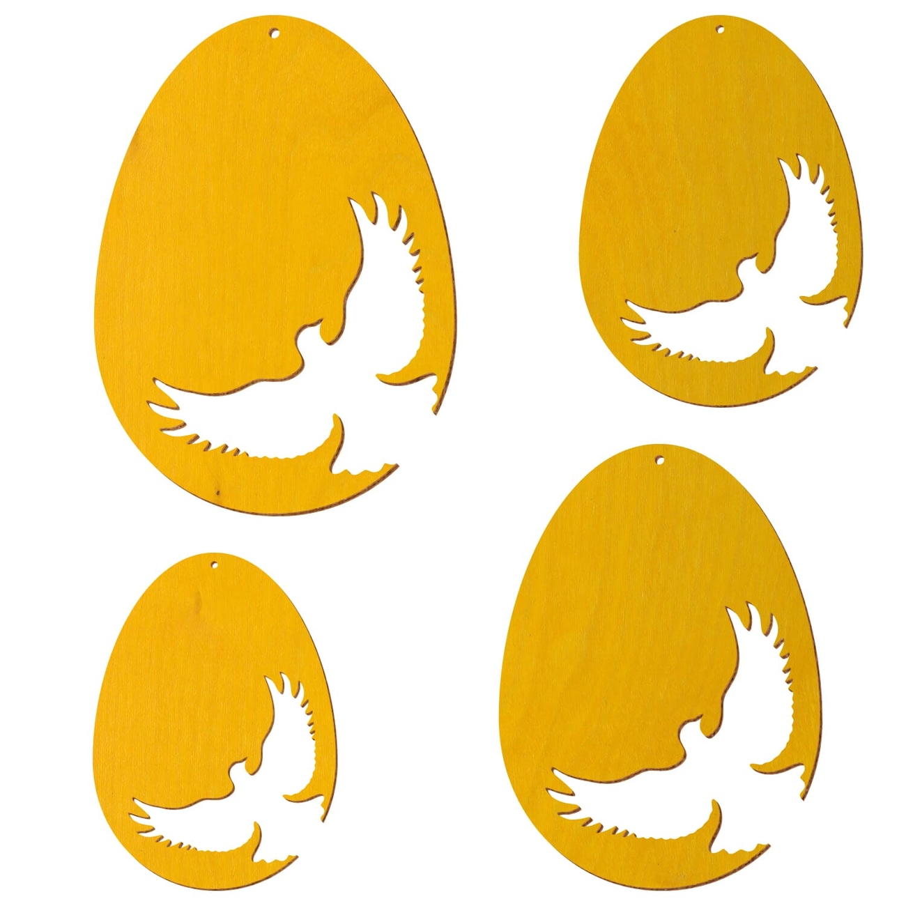 Motiv Osterei aus 3 mm starkem Birkensperrholz in der Farbe Gelb und mit Klarlack versiegelt - 16 verschiedene Motive mit Aufhängeloch Ø 3 mm - Größenauswahl von 7 bis 50 cm Höhe