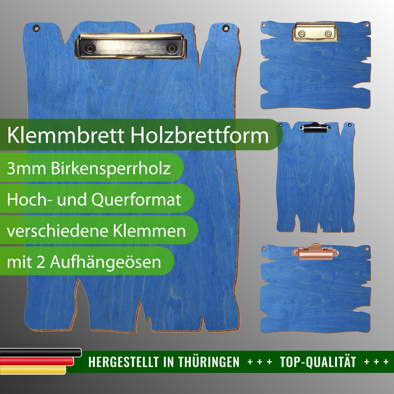 für DIN A3, A4, A5, A6 im Hoch- oder Querformat. Unsere Bütic Holz Klemmbretter aus 3mm Birkensperrholz mit 2 Ösen sind mit Klarlack versiegelt.