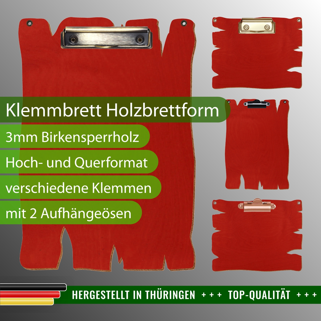 für DIN A3, A4, A5, A6 im Hoch- oder Querformat. Unsere Bütic Holz Klemmbretter aus 3mm Birkensperrholz mit 2 Ösen sind mit Klarlack versiegelt.