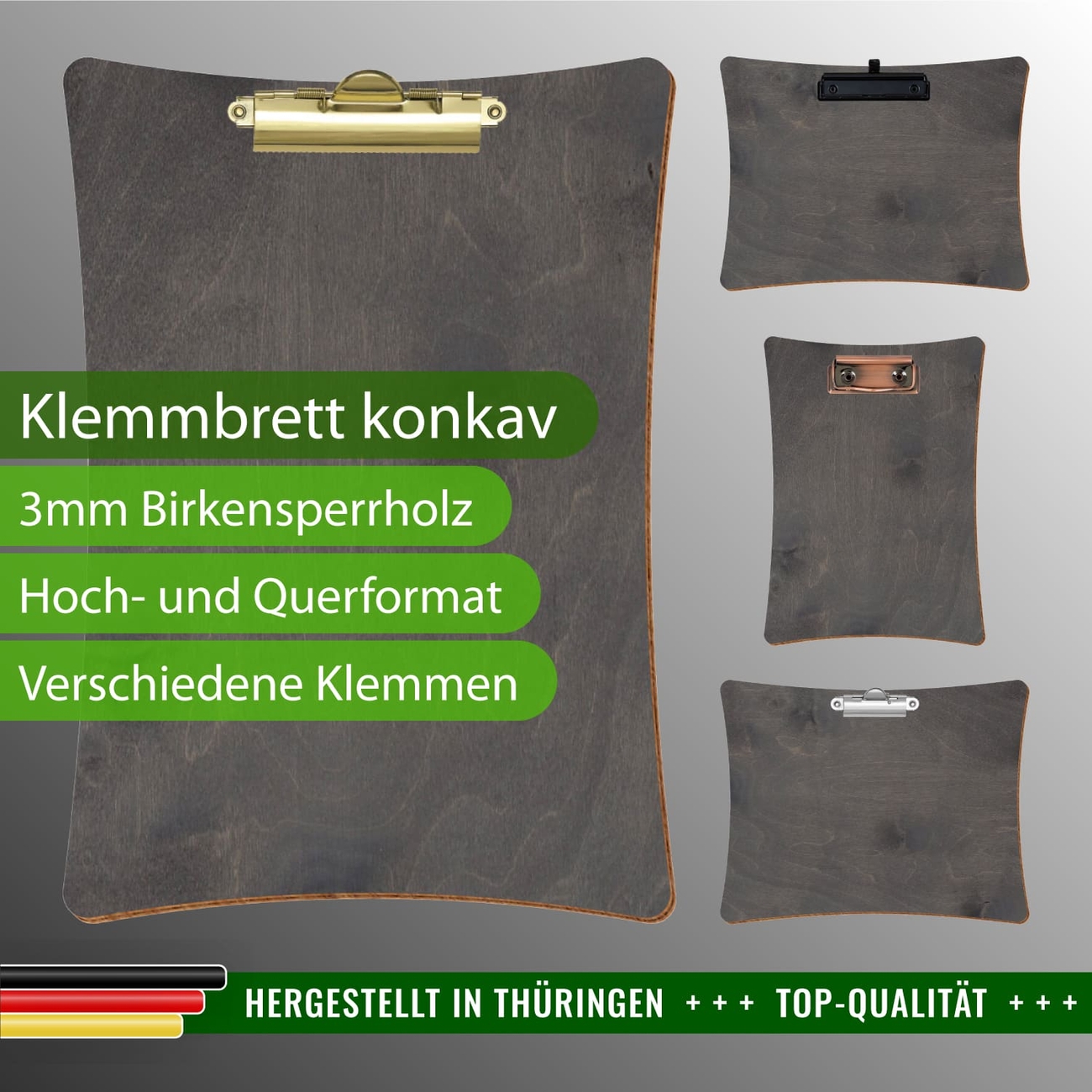 Bütic Holz Klemmbrett in abgerundeter, konkaver Form, Clipboard für A3, A4, A5 oder A6 Format, hoch oder quer.