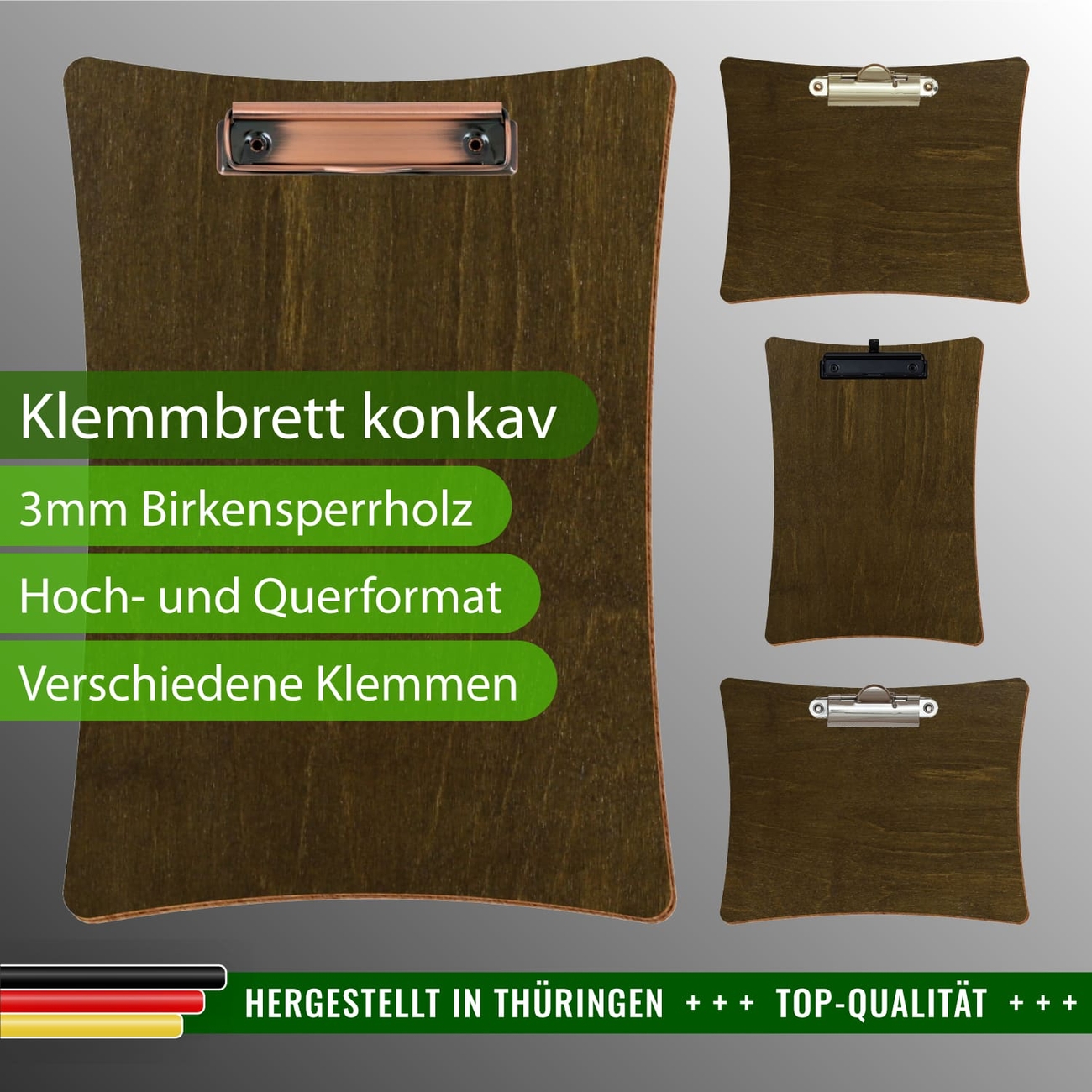 Bütic Holz Klemmbrett in abgerundeter, konkaver Form, Clipboard für A3, A4, A5 oder A6 Format, hoch oder quer.