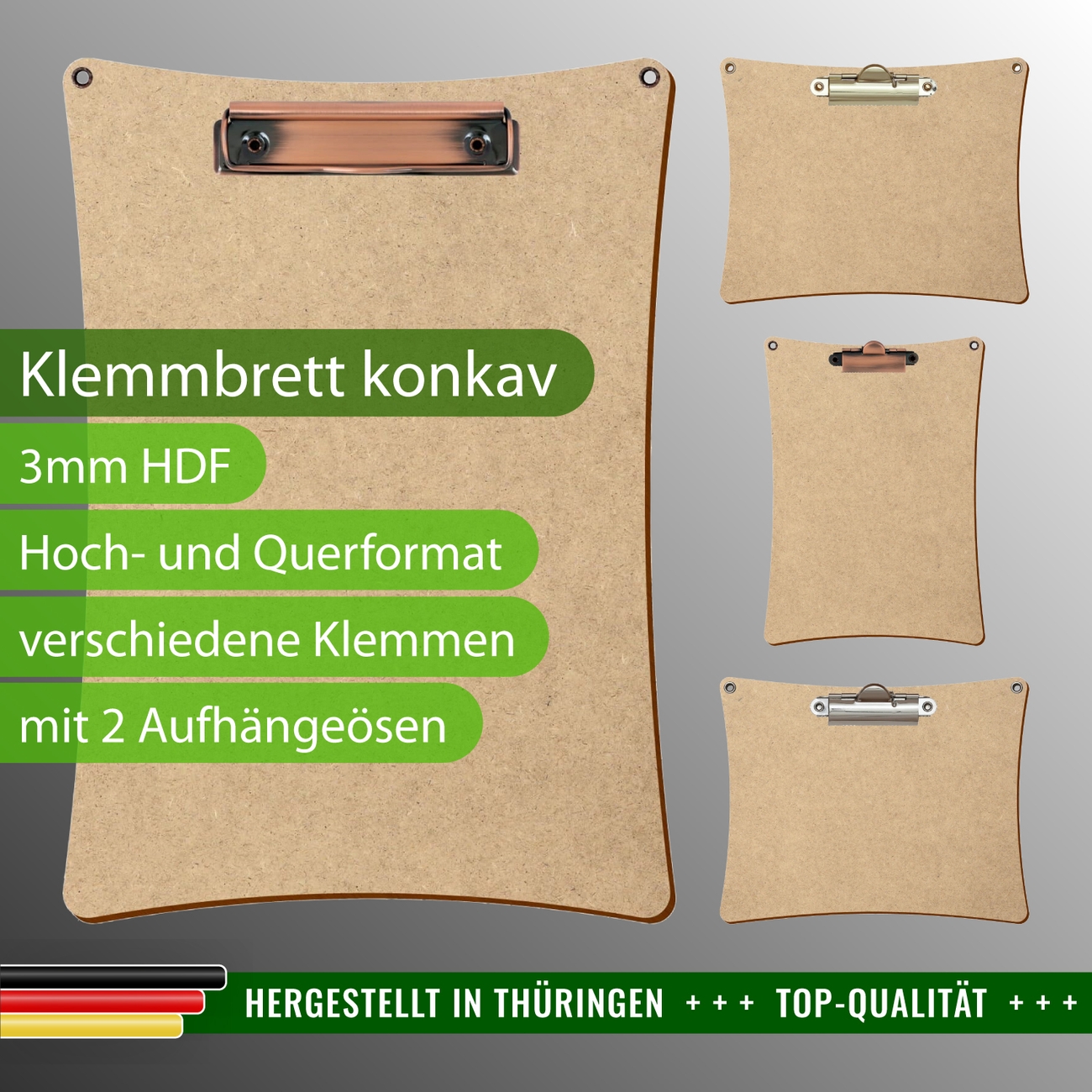 Bütic HDF Klemmbrett/Clipboard in konkaver Form mit 2 Aufhängeösen für A3, A4, A5 oder A6 Format, hoch oder quer.