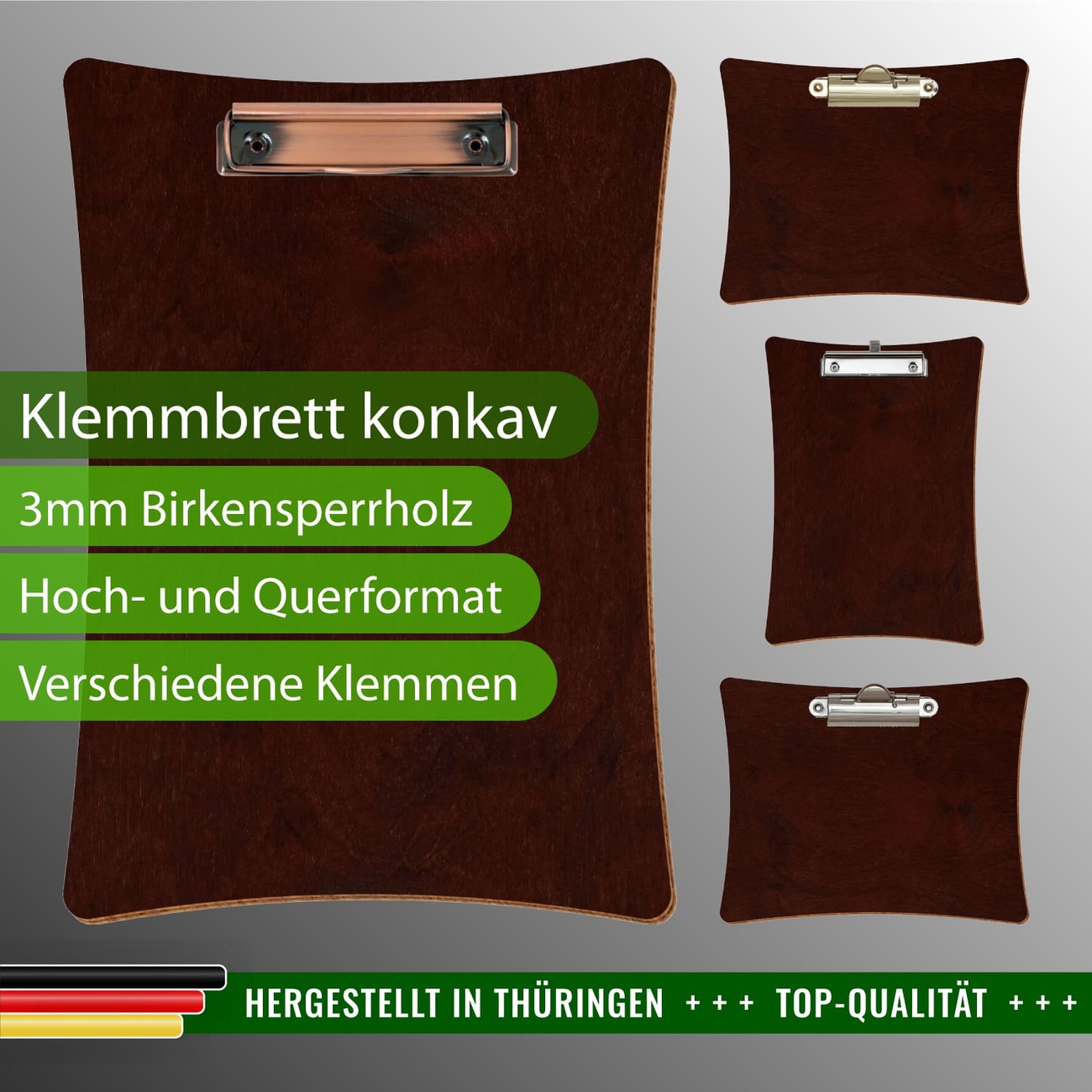 Bütic Holz Klemmbrett in abgerundeter, konkaver Form, Clipboard für A3, A4, A5 oder A6 Format, hoch oder quer.