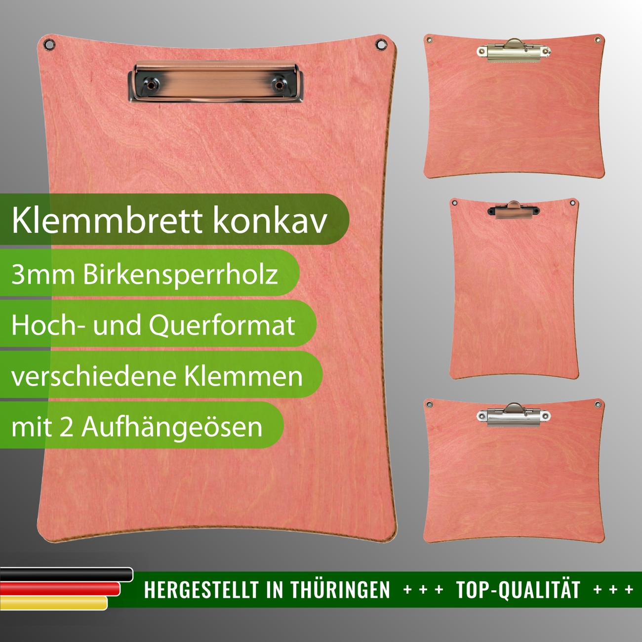 für DIN A3, A4, A5, A6 im Hoch- oder Querformat. Unsere Bütic Holz Klemmbretter aus 3mm Birkensperrholz mit 2 Ösen sind mit Klarlack versiegelt.