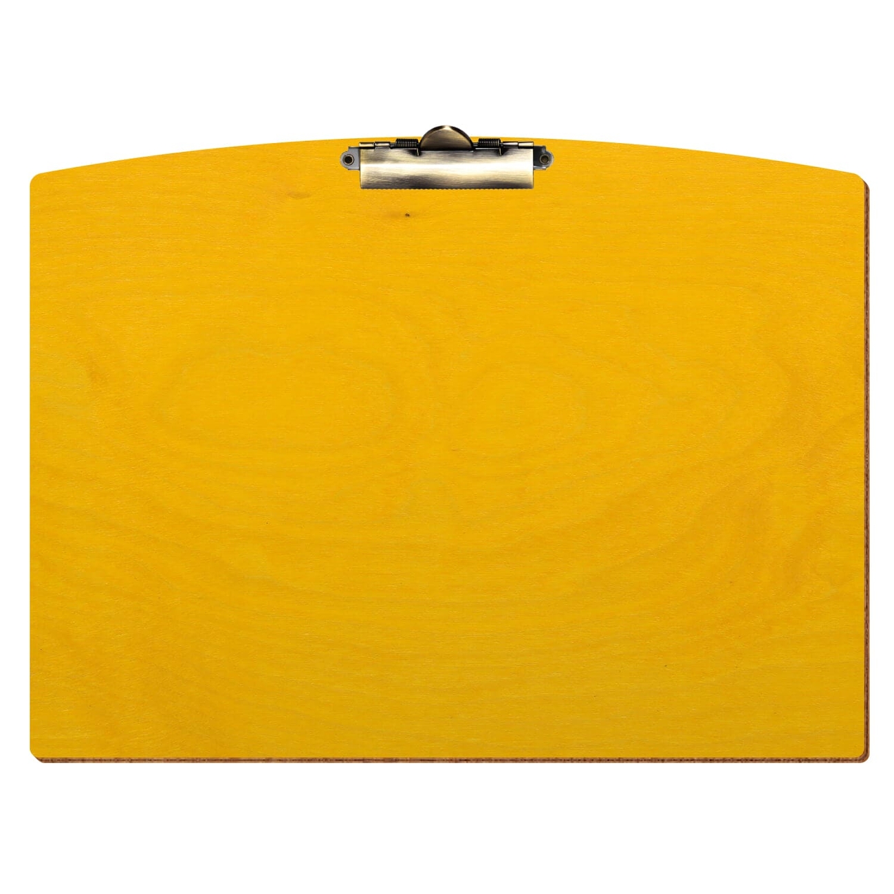 gelbes Holzklemmbrett, farbiges Klemmbrett, lackierte Schreibunterlage, Clipboard Segmentform, Speisekartenhalter mit Klemme, Schreibunterlage aus Holz