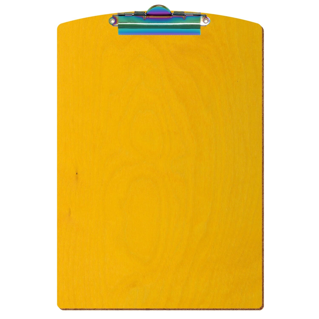 gelbes Holzklemmbrett, farbiges Klemmbrett, lackierte Schreibunterlage, Clipboard Segmentform, Speisekartenhalter mit Klemme, Schreibunterlage aus Holz
