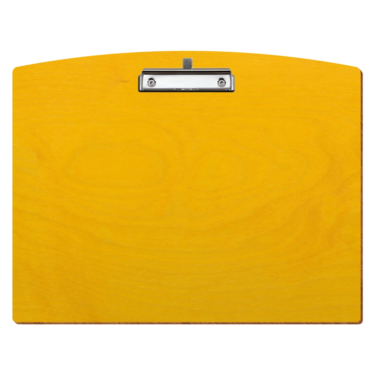 gelbes Holzklemmbrett, farbiges Klemmbrett, lackierte Schreibunterlage, Clipboard Segmentform, Speisekartenhalter mit Klemme, Schreibunterlage aus Holz