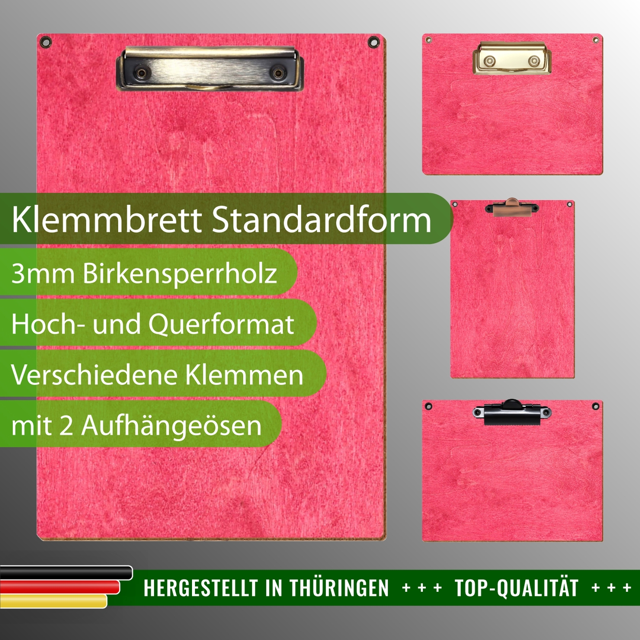 + Lieferumfang: ein Klemmbrett in ausgewählter Größe und Clipfarbe
