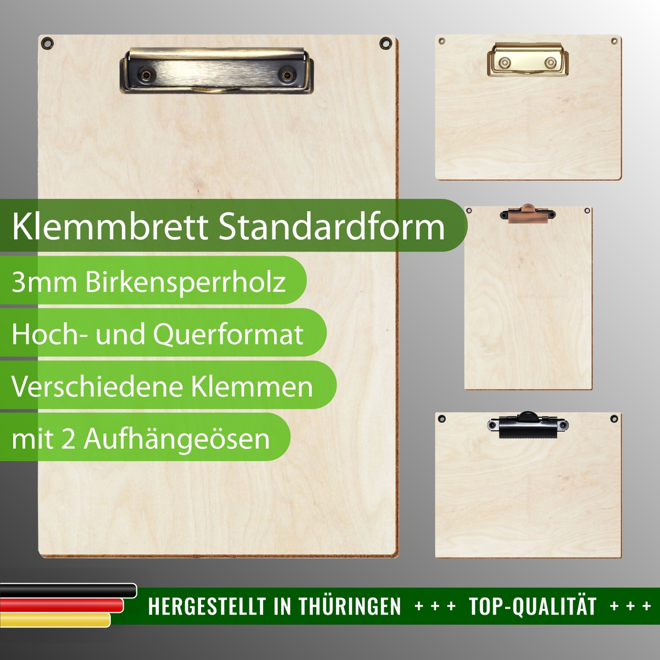 für DIN A3, A4, A5, A6 im Hoch- oder Querformat. Unsere Bütic Holz Klemmbretter aus 3mm HDF/MDF sind mit Klarlack versiegelt.