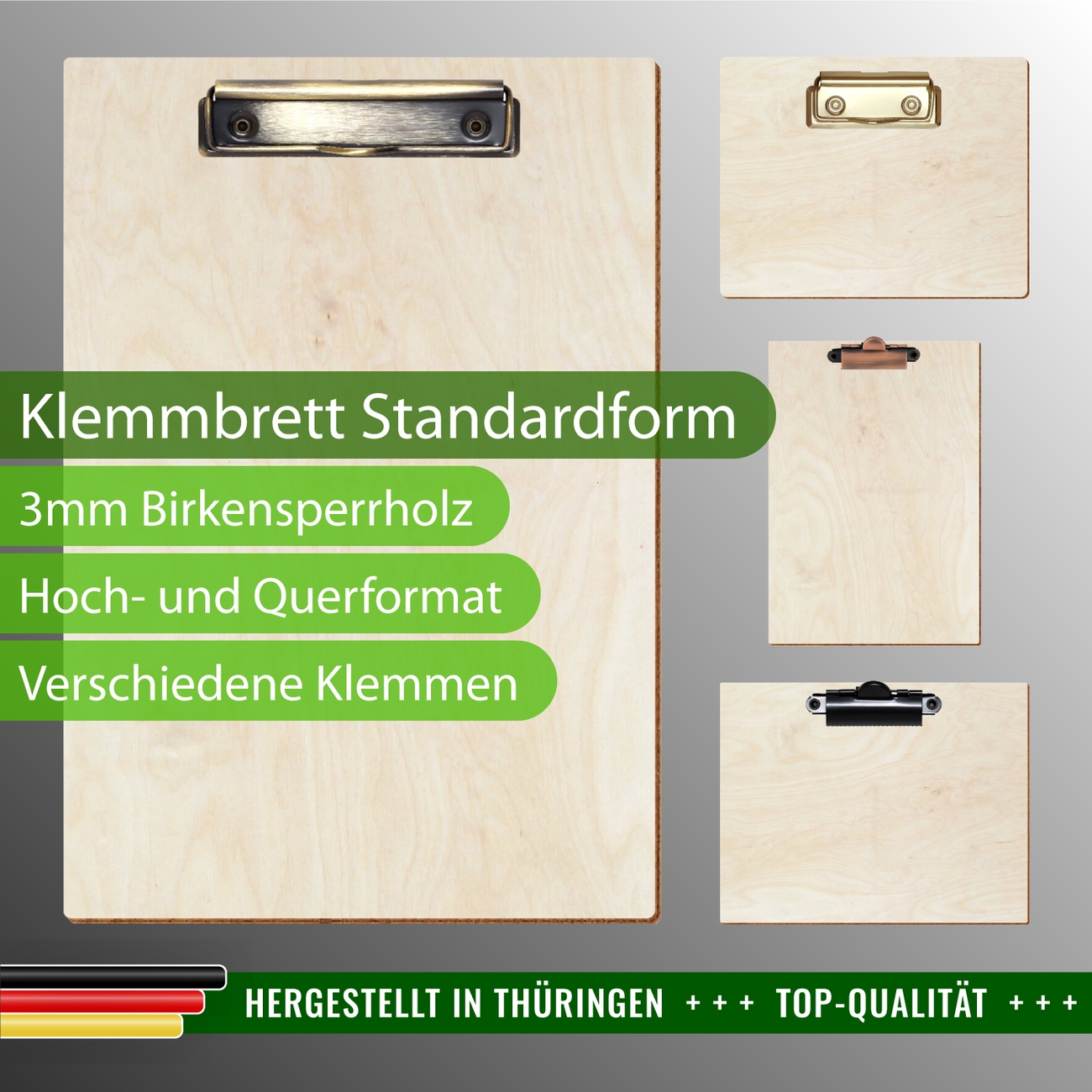 für DIN A3, A4, A5, A6 im Hoch- oder Querformat. Unsere Bütic Holz Klemmbretter aus 3mm Birkensperrholz sind mit Klarlack versiegelt.