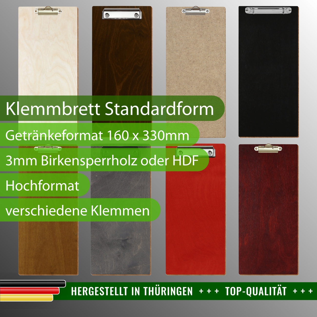 im Hochformat mit den Maßen 160 x 330mm und verschiedenen Klemmen zur Auswahl. Unsere Holz Klemmbretter aus 3mm Birkensperrholz sind mit Klarlack versiegelt.