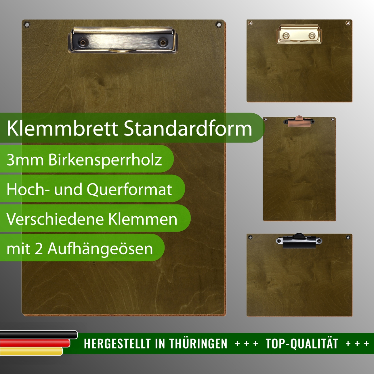 Holzklemmbrett Nussbaum hell, farbiges Klemmbrett, lackierte Schreibunterlage, Clipboard Standardform, Speisekartenhalter mit Klemme, Schreibunterlage aus HolzDazu passend...