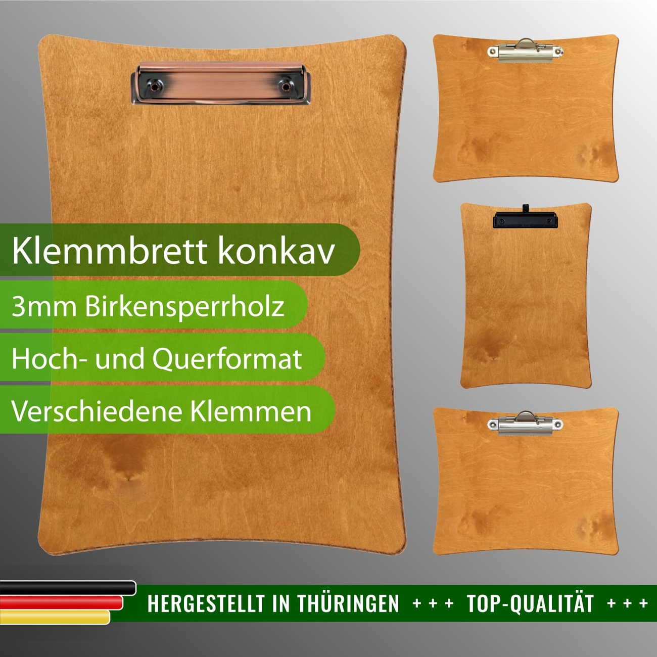 Bütic Holz Klemmbrett in abgerundeter, konkaver Form, Clipboard für A3, A4, A5 oder A6 Format, hoch oder quer.
