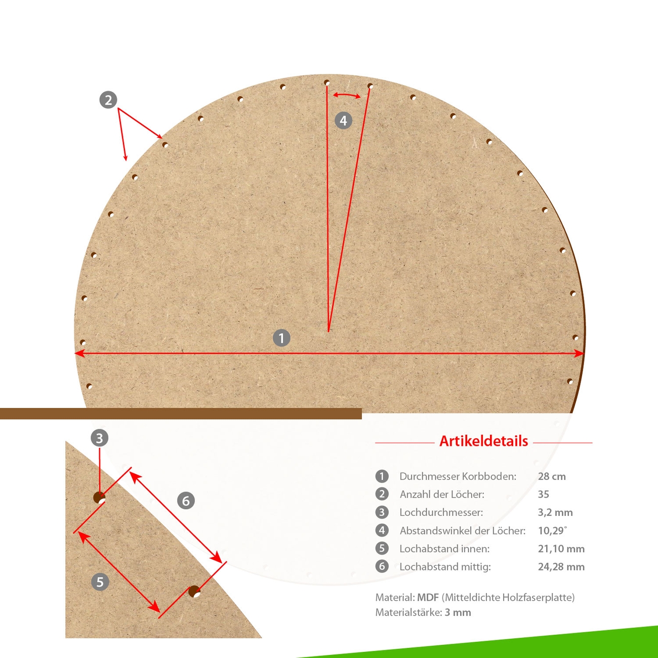 HDF/MDF Korbböden in kreisrunder Ausführung für 3mm Peddigrohr - Größen von 5-35cm wählbar - jeweils mit gerader und ungerader Lochanzahl
