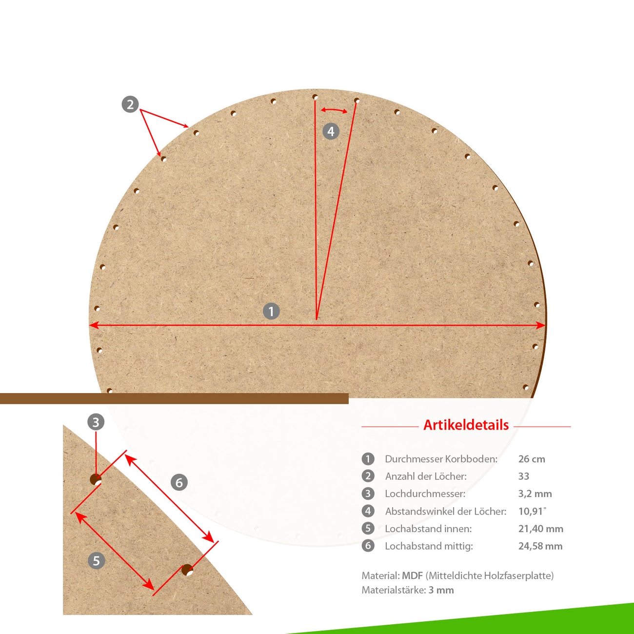 HDF/MDF Korbböden in kreisrunder Ausführung für 3mm Peddigrohr - Größen von 5-35cm wählbar - jeweils mit gerader und ungerader Lochanzahl