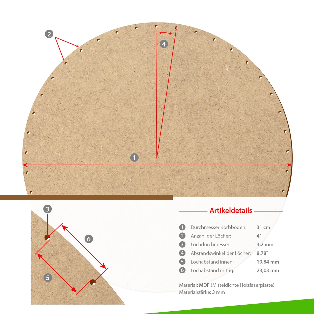 HDF/MDF Korbböden in kreisrunder Ausführung für 3mm Peddigrohr - Größen von 5-35cm wählbar - jeweils mit gerader und ungerader Lochanzahl