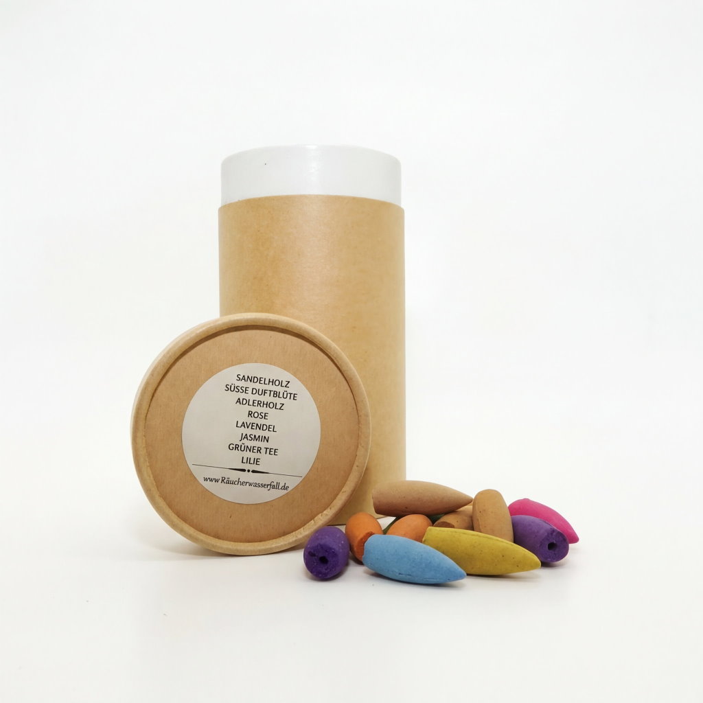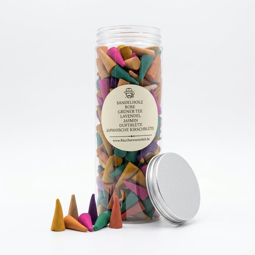 Räucherkegel, Rückfluss Räucherkegel, Rauch-Wasserfall, Räucherwerk, Duftkegel, Aromatherapie, Meditation, Yoga, Entspannung, Wellness, Sandelholz, Lavendel, Jasmin, Rose, Lilie, Grüner Tee, Duftblüte, Adlerholz, Thuja, Japanische Kirschblüte, Großpackung, Geschenkset, Probierset