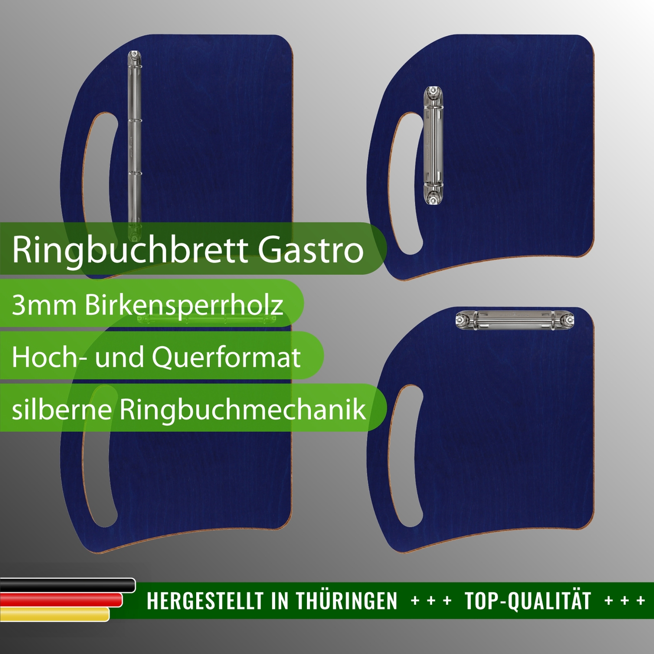 Dunkelblaues Ringbuchbrett, Ringbuch aus Birkensperrholz, farbige Schreibunterlage, Gastro Clipboard, Speisekartenhalter mit Ringbuchmechanik, Schreibunterlage aus Holz