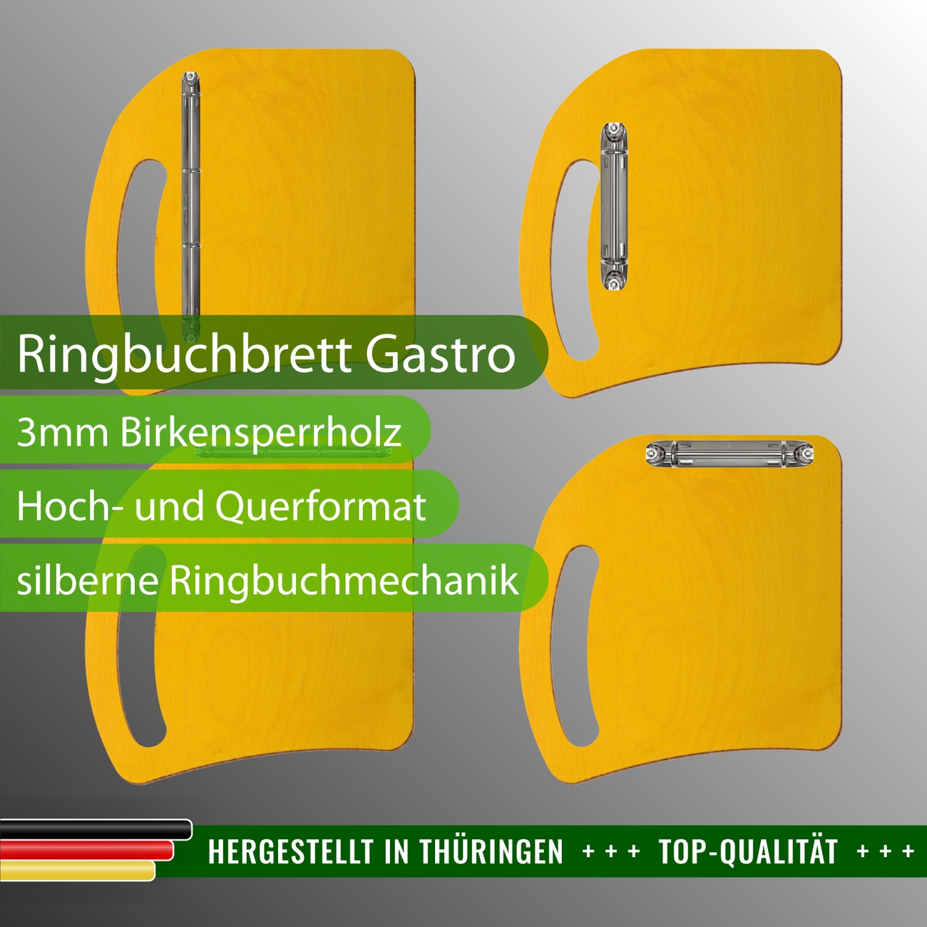 Gelbes Ringbuchbrett, Ringbuch aus Birkensperrholz, farbige Schreibunterlage, Gastro Clipboard, Speisekartenhalter mit Ringbuchmechanik, Schreibunterlage aus Holz