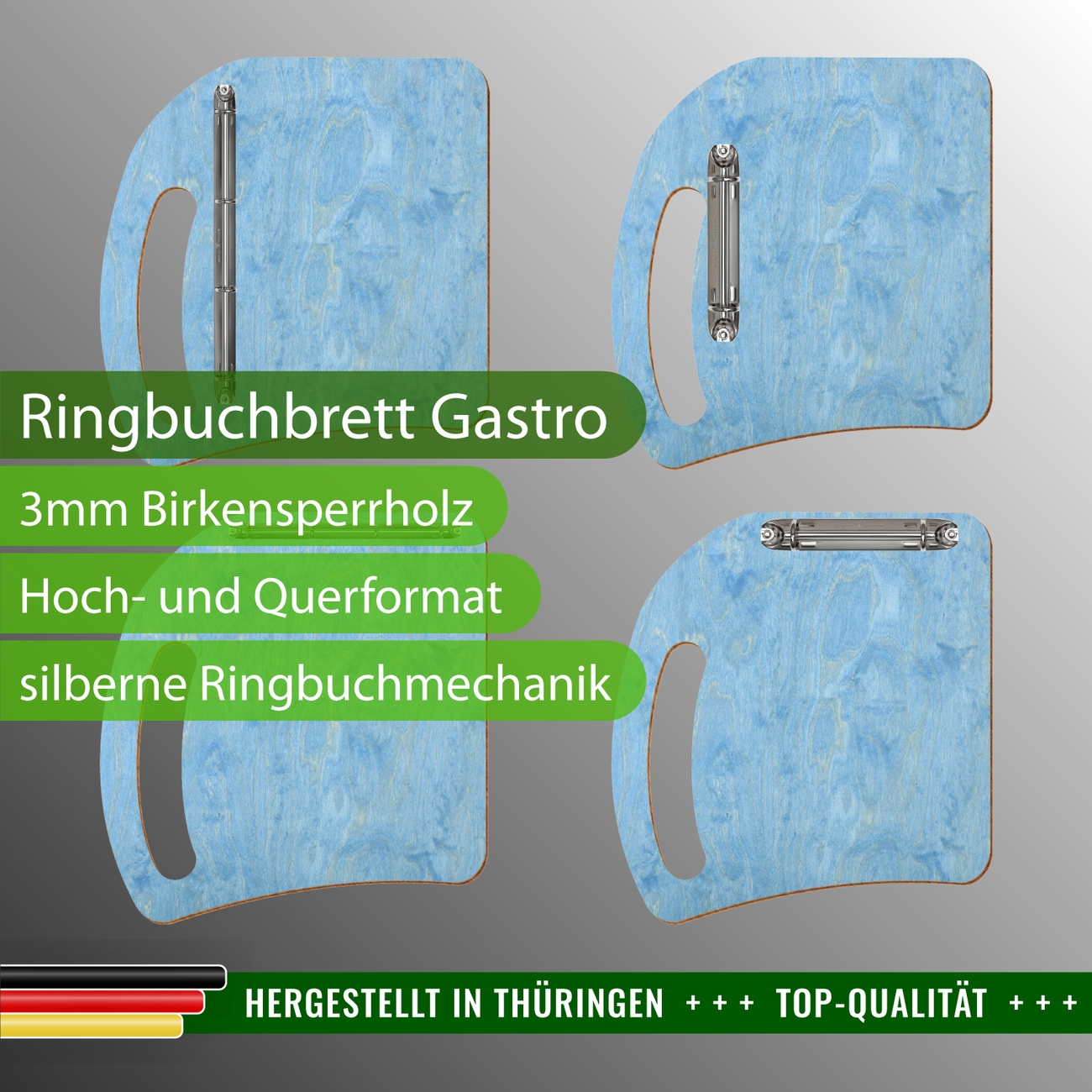 Hellblaues Ringbuchbrett, Ringbuch aus Birkensperrholz, farbige Schreibunterlage, Gastro Clipboard, Speisekartenhalter mit Ringbuchmechanik, Schreibunterlage aus Holz