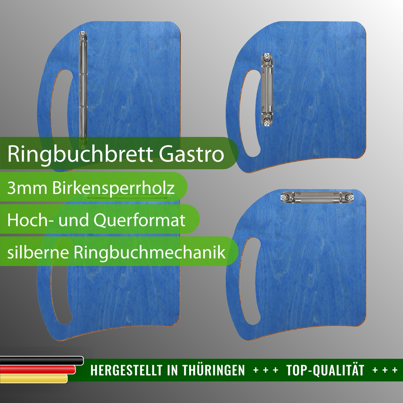 Kornblumenblaues Ringbuchbrett, Ringbuch aus Birkensperrholz, farbige Schreibunterlage, Gastro Clipboard, Speisekartenhalter mit Ringbuchmechanik, Schreibunterlage aus Holz