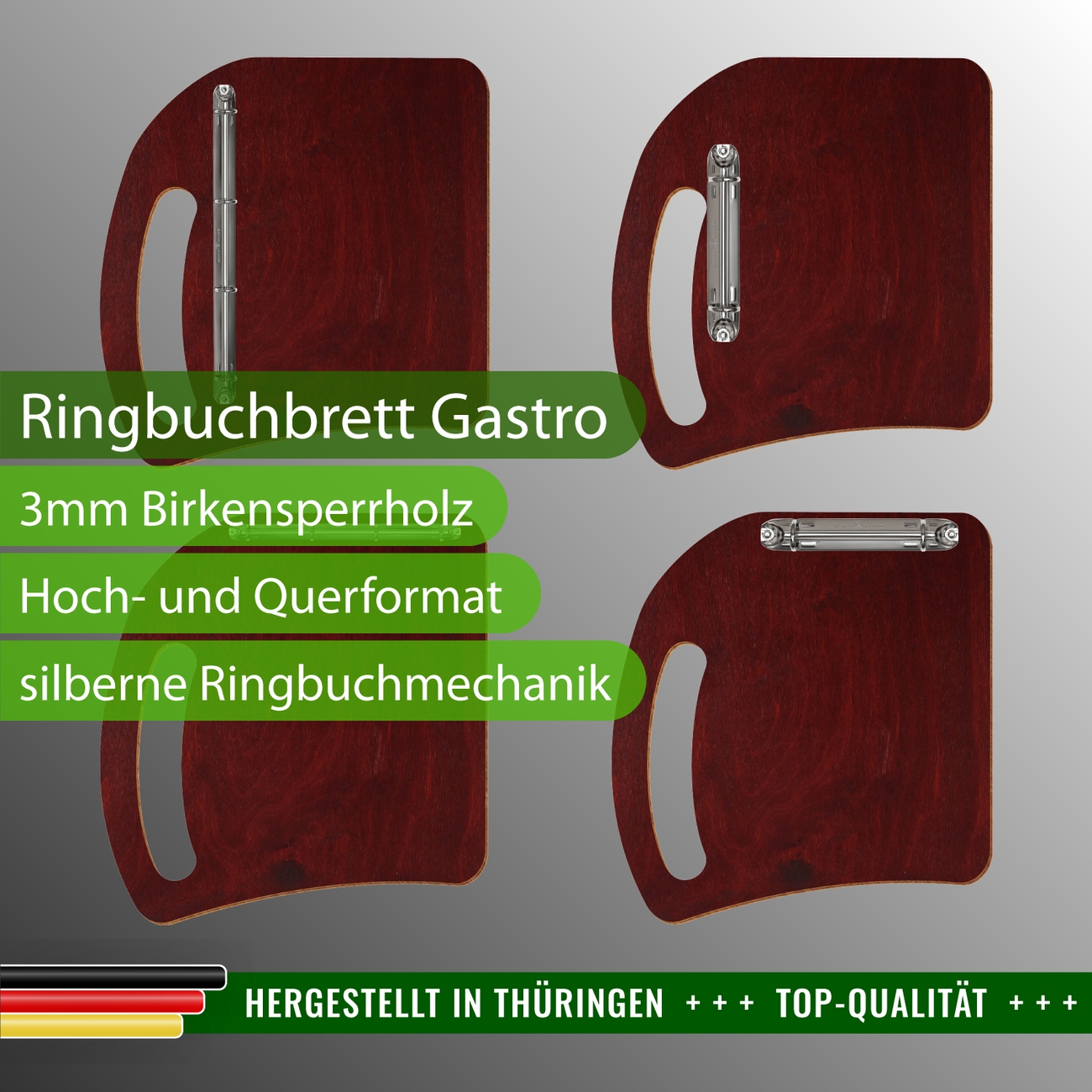 Ringbuchbrett Mahagoni, Ringbuch aus Birkensperrholz, farbige Schreibunterlage, Gastro Clipboard, Speisekartenhalter mit Ringbuchmechanik, Schreibunterlage aus Holz