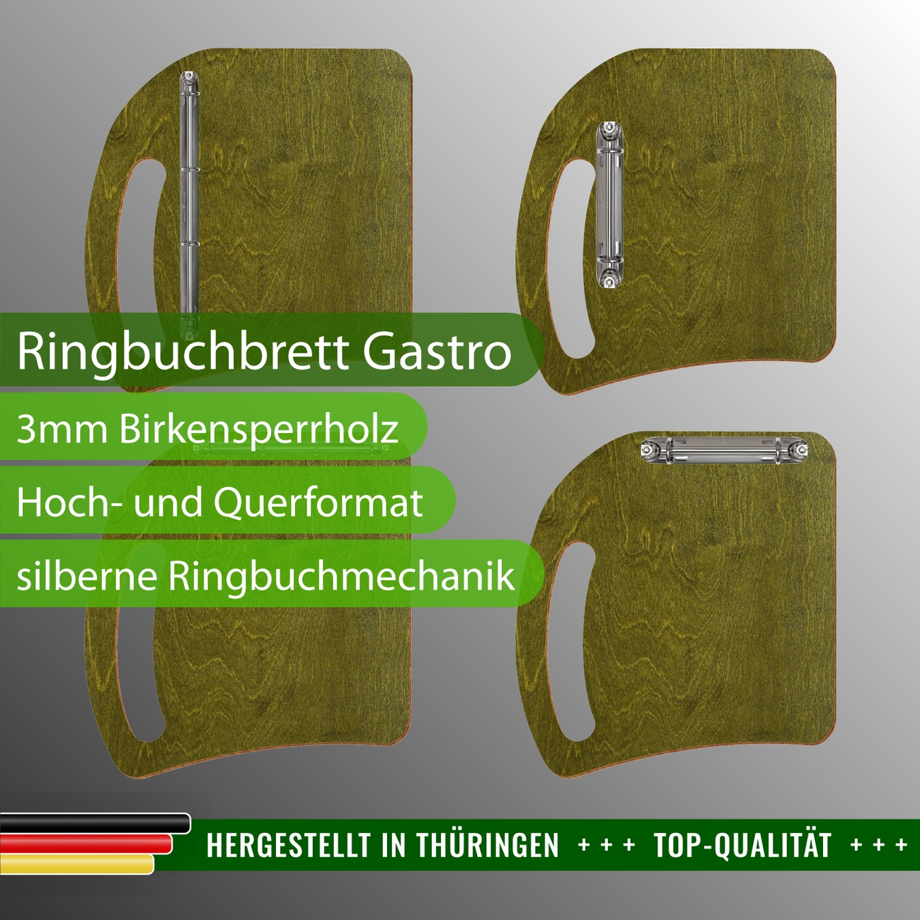 Olivgrünes Ringbuchbrett, Ringbuch aus Birkensperrholz, farbige Schreibunterlage, Gastro Clipboard, Speisekartenhalter mit Ringbuchmechanik, Schreibunterlage aus Holz