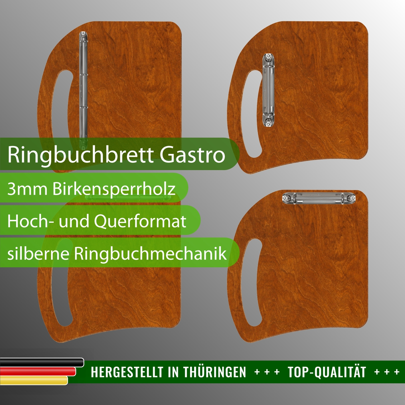 Ringbuchbrett Rum, Ringbuch aus Birkensperrholz, farbige Schreibunterlage, Gastro Clipboard, Speisekartenhalter mit Ringbuchmechanik, Schreibunterlage aus Holz