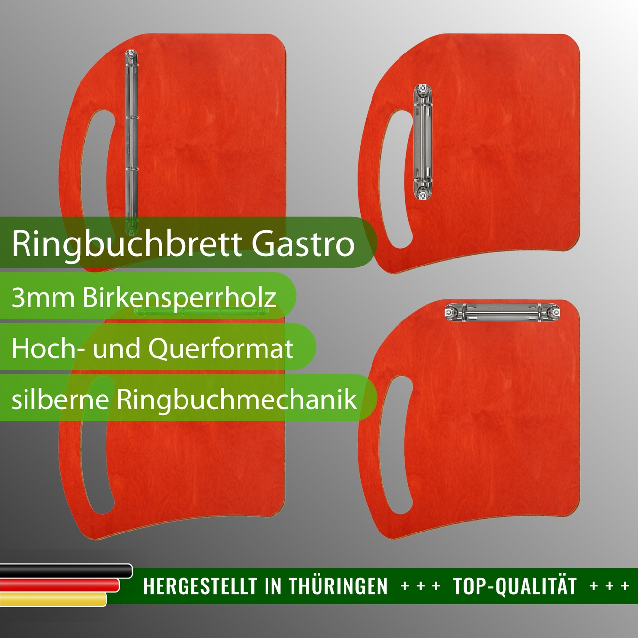 Scharlachrotes Ringbuchbrett, Ringbuch aus Birkensperrholz, farbige Schreibunterlage, Gastro Clipboard, Speisekartenhalter mit Ringbuchmechanik, Schreibunterlage aus Holz