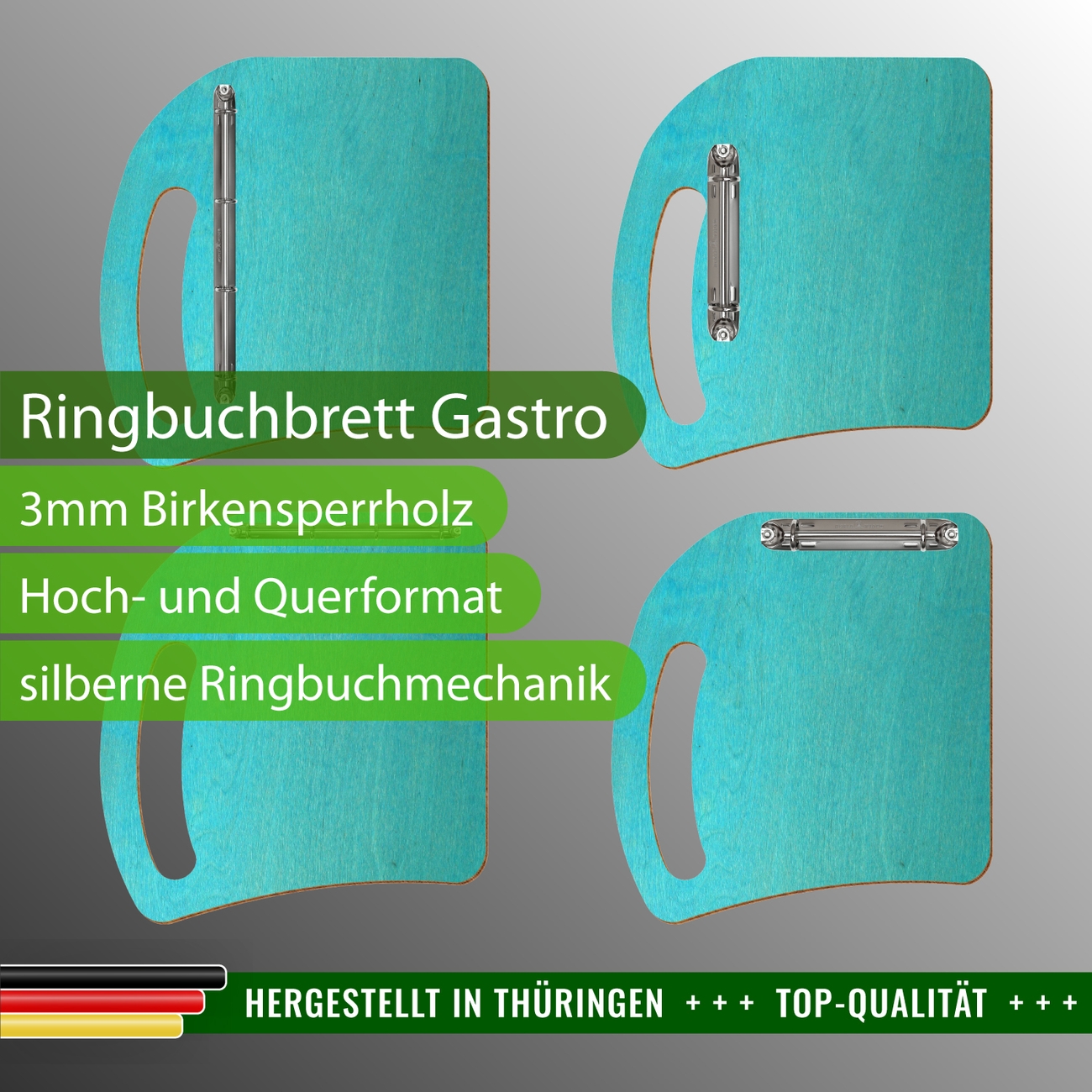 Türkises Ringbuchbrett, Ringbuch aus Birkensperrholz, farbige Schreibunterlage, Gastro Clipboard, Speisekartenhalter mit Ringbuchmechanik, Schreibunterlage aus Holz