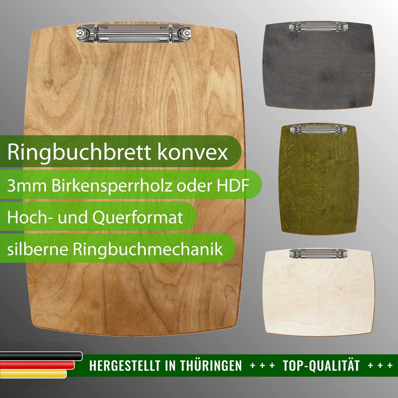 farbiges Ringbuchbrett, lackierte Schreibunterlage, konvexes Clipboard, Speisekartenhalter mit Ringbuchmechanik, Schreibunterlage aus HolzDazu passend...