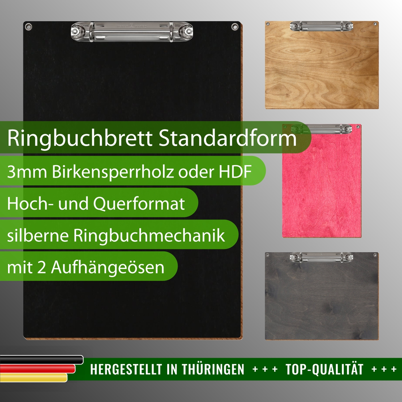 + Lieferumfang: ein Ringbuchbrett in ausgewählter Größe und Farbe